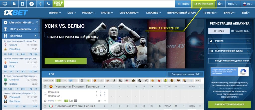 Официальный сайт букмекерской конторы 1xBet выполнен в простом и интуитивно понятном интерфейсе, с которым сможет быстро разобраться даже клиент без опыта. Вверху главной страницы находятся кнопки «Регистрация», «Вход», яркие баннеры и панель навигации. Внизу экрана гости найдут пользовательское соглашение, политику конфиденциальности, условия и принципы ответственной игры.